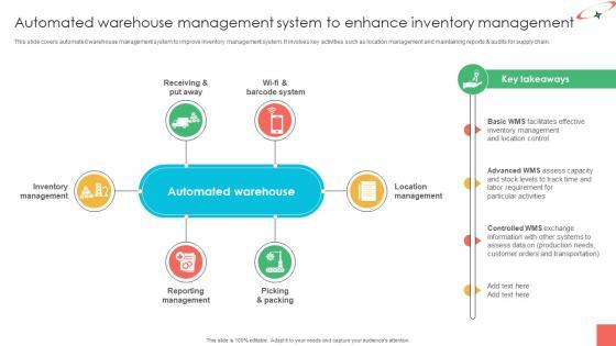 This slide covers automated warehouse management system to improve inventory management system. It involves key activities such as location management and maintaining reports and audits for supply chain. Want to ace your presentation in front of a live audience Our Marketing Strategies For Effective Automated Warehouse Management System can help you do that by engaging all the users towards you. Slidegeeks experts have put their efforts and expertise into creating these impeccable powerpoint presentations so that you can communicate your ideas clearly. Moreover, all the templates are customizable, and easy-to-edit and downloadable. Use these for both personal and commercial use. This slide covers automated warehouse management system to improve inventory management system. It involves key activities such as location management and maintaining reports and audits for supply chain.