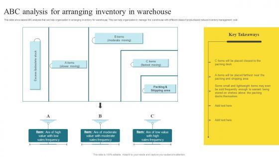 This slide showcases ABC analysis that can help organization in arranging inventory for warehouse. This can help organization in manage the warehouse with different class of products and reduce inventory management cost. Find a pre designed and impeccable ABC Analysis For Arranging Methods To Enhance Warehouse Space Utilization Template Pdf. The templates can ace your presentation without additional effort. You can download these easy to edit presentation templates to make your presentation stand out from others. So, what are you waiting for Download the template from Slidegeeks today and give a unique touch to your presentation. This slide showcases ABC analysis that can help organization in arranging inventory for warehouse. This can help organization in manage the warehouse with different class of products and reduce inventory management cost.