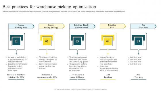 This slide showcases best practices that can help organization in warehouse picking optimization. it includes reduce walking time, correct picking strategy, prioritize timely replenishment and establish KPIs. Slidegeeks is one of the best resources for PowerPoint templates. You can download easily and regulate Best Practices For Warehouse Methods To Enhance Warehouse Space Utilization Structure Pdf for your personal presentations from our wonderful collection. A few clicks is all it takes to discover and get the most relevant and appropriate templates. Use our Templates to add a unique zing and appeal to your presentation and meetings. All the slides are easy to edit and you can use them even for advertisement purposes. This slide showcases best practices that can help organization in warehouse picking optimization. it includes reduce walking time, correct picking strategy, prioritize timely replenishment and establish KPIs.