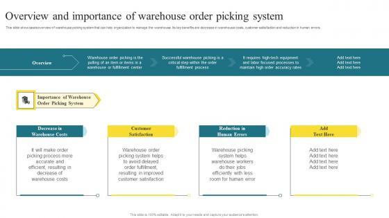 This slide showcases overview of warehouse picking system that can help organization to manage the warehouse. Its key benefits are decrease in warehouse costs, customer satisfaction and reduction in human errors. Make sure to capture your audiences attention in your business displays with our gratis customizable Overview And Importance Of Warehouse Methods To Enhance Warehouse Space Utilization Diagrams Pdf. These are great for business strategies, office conferences, capital raising or task suggestions. If you desire to acquire more customers for your tech business and ensure they stay satisfied, create your own sales presentation with these plain slides. This slide showcases overview of warehouse picking system that can help organization to manage the warehouse. Its key benefits are decrease in warehouse costs, customer satisfaction and reduction in human errors.