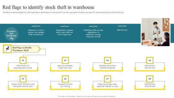 This slide showcases red flags that cn help organization in identification of warehouse theft. It can help organization to evaluate core reason for warehouse theft and preventing further loss. This Red Flags To Identify Stock Methods To Enhance Warehouse Space Utilization Microsoft Pdf is perfect for any presentation, be it in front of clients or colleagues. It is a versatile and stylish solution for organizing your meetings. The product features a modern design for your presentation meetings. The adjustable and customizable slides provide unlimited possibilities for acing up your presentation. Slidegeeks has done all the homework before launching the product for you. So, do not wait, grab the presentation templates today This slide showcases red flags that cn help organization in identification of warehouse theft. It can help organization to evaluate core reason for warehouse theft and preventing further loss.