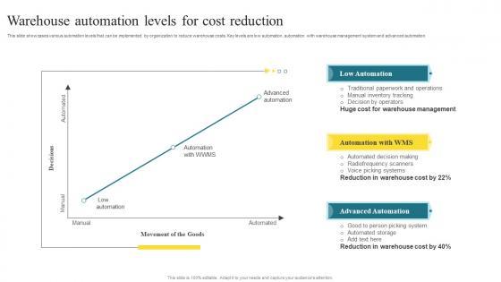 This slide showcases various automation levels that can be implemented by organization to reduce warehouse costs. Key levels are low automation, automation with warehouse management system and advanced automation. Are you searching for a Warehouse Automation Levels Methods To Enhance Warehouse Space Utilization Diagrams Pdf that is uncluttered, straightforward, and original Its easy to edit, and you can change the colors to suit your personal or business branding. For a presentation that expresses how much effort you have put in, this template is ideal With all of its features, including tables, diagrams, statistics, and lists, its perfect for a business plan presentation. Make your ideas more appealing with these professional slides. Download Warehouse Automation Levels Methods To Enhance Warehouse Space Utilization Diagrams Pdf from Slidegeeks today. This slide showcases various automation levels that can be implemented by organization to reduce warehouse costs. Key levels are low automation, automation with warehouse management system and advanced automation.