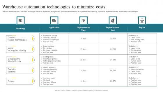 This slide showcases various automation technologies that can be implemented by organization to reduce warehouse costs. Its key elements are technology, applications, implementation time, implementation cost and impact. Retrieve professionally designed Warehouse Automation Technologies Methods To Enhance Warehouse Space Utilization Brochure Pdf to effectively convey your message and captivate your listeners. Save time by selecting pre made slideshows that are appropriate for various topics, from business to educational purposes. These themes come in many different styles, from creative to corporate, and all of them are easily adjustable and can be edited quickly. Access them as PowerPoint templates or as Google Slides themes. You do not have to go on a hunt for the perfect presentation because Slidegeeks got you covered from everywhere. This slide showcases various automation technologies that can be implemented by organization to reduce warehouse costs. Its key elements are technology, applications, implementation time, implementation cost and impact.