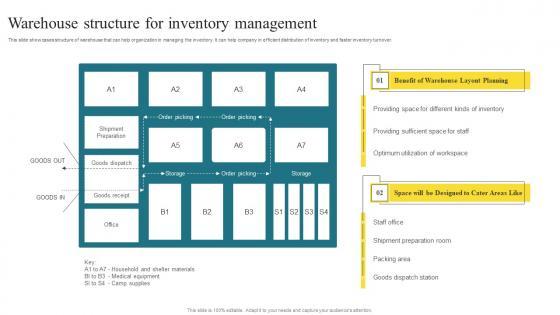 This slide showcases structure of warehouse that can help organization in managing the inventory. It can help company in efficient distribution of inventory and faster inventory turnover. Here you can discover an assortment of the finest PowerPoint and Google Slides templates. With these templates, you can create presentations for a variety of purposes while simultaneously providing your audience with an eye catching visual experience. Download Warehouse Structure For Inventory Methods To Enhance Warehouse Space Utilization Template Pdf to deliver an impeccable presentation. These templates will make your job of preparing presentations much quicker, yet still, maintain a high level of quality. Slidegeeks has experienced researchers who prepare these templates and write high quality content for you. Later on, you can personalize the content by editing the Warehouse Structure For Inventory Methods To Enhance Warehouse Space Utilization Template Pdf. This slide showcases structure of warehouse that can help organization in managing the inventory. It can help company in efficient distribution of inventory and faster inventory turnover.