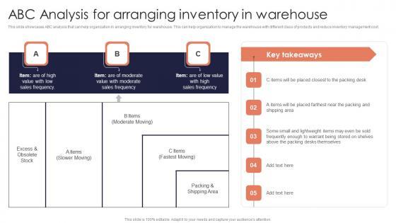 This slide showcases ABC analysis that can help organization in arranging inventory for warehouse. This can help organization in the warehouse with different class of products and reduce inventory management cost. Make sure to capture your audiences attention in your business displays with our gratis customizable Procurement Strategies For Reducing Stock Wastage ABC Analysis For Arranging Inventory Topics PDF. These are great for business strategies, office conferences, capital raising or task suggestions. If you desire to acquire more customers for your tech business and ensure they stay satisfied, create your own sales presentation with these plain slides.