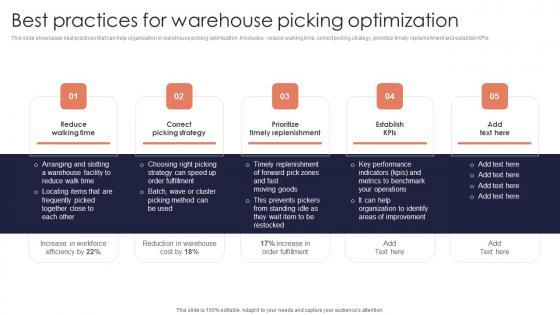 This slide showcases best practices that can help organization in warehouse picking optimization. it includes reduce walking time, correct picking strategy, prioritize timely replenishment and establish KPIs. Slidegeeks is one of the best resources for PowerPoint templates. You can download easily and regulate Best Practices Warehouse Picking Minimizing Inventory Wastage Through Warehouse Elements Pdf for your personal presentations from our wonderful collection. A few clicks is all it takes to discover and get the most relevant and appropriate templates. Use our Templates to add a unique zing and appeal to your presentation and meetings. All the slides are easy to edit and you can use them even for advertisement purposes. This slide showcases best practices that can help organization in warehouse picking optimization. it includes reduce walking time, correct picking strategy, prioritize timely replenishment and establish KPIs.