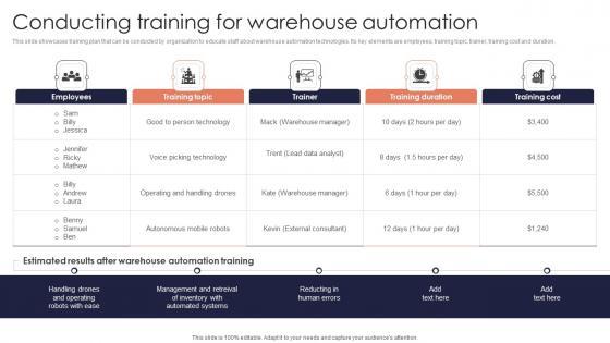 This slide showcases training plan that can be conducted by organization to educate staff about warehouse automation technologies. Its key elements are employees, training topic, trainer, training cost and duration. Want to ace your presentation in front of a live audience Our Conducting Training Warehouse Minimizing Inventory Wastage Through Warehouse Structure Pdf can help you do that by engaging all the users towards you. Slidegeeks experts have put their efforts and expertise into creating these impeccable powerpoint presentations so that you can communicate your ideas clearly. Moreover, all the templates are customizable, and easy to edit and downloadable. Use these for both personal and commercial use. This slide showcases training plan that can be conducted by organization to educate staff about warehouse automation technologies. Its key elements are employees, training topic, trainer, training cost and duration.