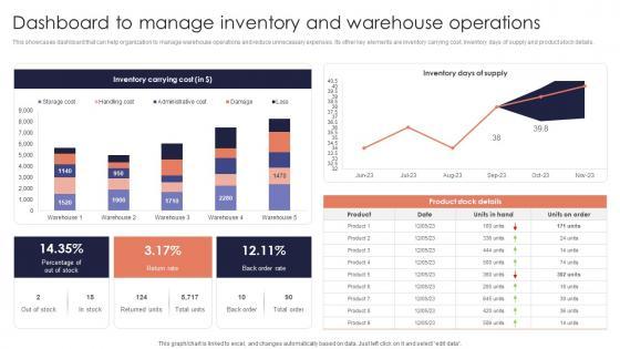 This showcases dashboard that can help organization to manage warehouse operations and reduce unnecessary expenses. Its other key elements are inventory carrying cost, inventory days of supply and product stock details. There are so many reasons you need a Dashboard Manage Inventory Minimizing Inventory Wastage Through Warehouse Microsoft Pdf. The first reason is you can not spend time making everything from scratch, Thus, Slidegeeks has made presentation templates for you too. You can easily download these templates from our website easily. This showcases dashboard that can help organization to manage warehouse operations and reduce unnecessary expenses. Its other key elements are inventory carrying cost, inventory days of supply and product stock details.