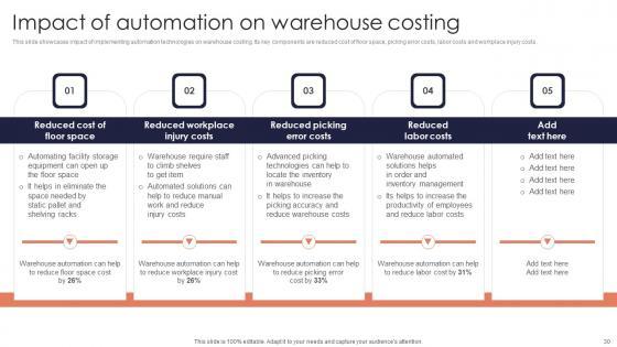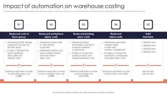 This slide showcases impact of implementing automation technologies on warehouse costing. Its key components are reduced cost of floor space, picking error costs, labor costs and workplace injury costs. Slidegeeks is here to make your presentations a breeze with Impact Automation On Warehouse Minimizing Inventory Wastage Through Warehouse Download Pdf With our easy to use and customizable templates, you can focus on delivering your ideas rather than worrying about formatting. With a variety of designs to choose from, you are sure to find one that suits your needs. And with animations and unique photos, illustrations, and fonts, you can make your presentation pop. So whether you are giving a sales pitch or presenting to the board, make sure to check out Slidegeeks first This slide showcases impact of implementing automation technologies on warehouse costing. Its key components are reduced cost of floor space, picking error costs, labor costs and workplace injury costs.