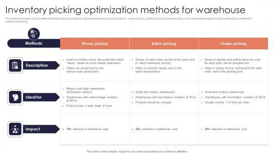 This slide showcases various methods that can help organization in optimized warehouse picking that are waves picking, batch picking and cluster picking. it also showcases impact of implementing these methods in warehouse picking. Whether you have daily or monthly meetings, a brilliant presentation is necessary. Inventory Picking Optimization Minimizing Inventory Wastage Through Warehouse Topics Pdf can be your best option for delivering a presentation. Represent everything in detail using Inventory Picking Optimization Minimizing Inventory Wastage Through Warehouse Topics Pdf and make yourself stand out in meetings. The template is versatile and follows a structure that will cater to your requirements. All the templates prepared by Slidegeeks are easy to download and edit. Our research experts have taken care of the corporate themes as well. So, give it a try and see the results. This slide showcases various methods that can help organization in optimized warehouse picking that are waves picking, batch picking and cluster picking. it also showcases impact of implementing these methods in warehouse picking.