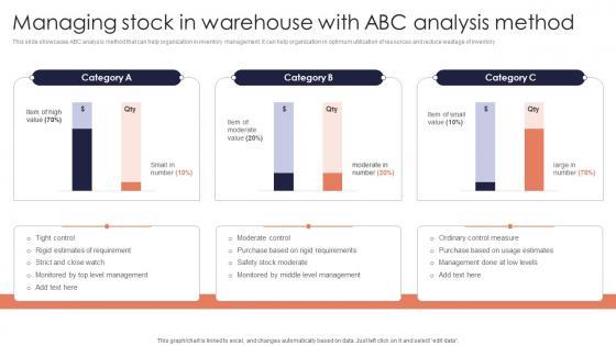 This slide showcases ABC analysis method that can help organization in inventory management. It can help organization in optimum utilization of resources and reduce wastage of inventory. If you are looking for a format to display your unique thoughts, then the professionally designed Managing Stock Warehouse Minimizing Inventory Wastage Through Warehouse Background Pdf is the one for you. You can use it as a Google Slides template or a PowerPoint template. Incorporate impressive visuals, symbols, images, and other charts. Modify or reorganize the text boxes as you desire. Experiment with shade schemes and font pairings. Alter, share or cooperate with other people on your work. Download Managing Stock Warehouse Minimizing Inventory Wastage Through Warehouse Background Pdf and find out how to give a successful presentation. Present a perfect display to your team and make your presentation unforgettable. This slide showcases ABC analysis method that can help organization in inventory management. It can help organization in optimum utilization of resources and reduce wastage of inventory.
