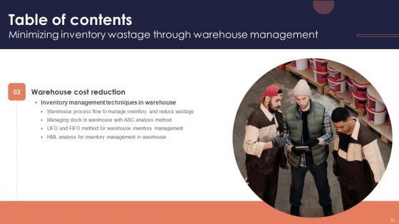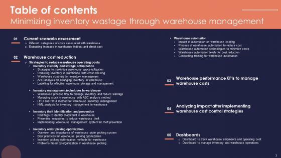 The best PPT templates are a great way to save time, energy, and resources. Slidegeeks have 100 percent editable powerpoint slides making them incredibly versatile. With these quality presentation templates, you can create a captivating and memorable presentation by combining visually appealing slides and effectively communicating your message. Download Table Of Contents Minimizing Inventory Wastage Through Warehouse Management Themes Pdf from Slidegeeks and deliver a wonderful presentation. Our Table Of Contents Minimizing Inventory Wastage Through Warehouse Management Themes Pdf are topically designed to provide an attractive backdrop to any subject. Use them to look like a presentation pro.