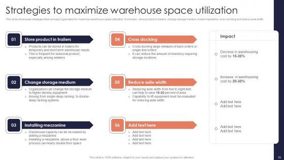 This slide showcases strategies that can help organization to maximize warehouse space utilization. It includes store product in trailers, change storage medium, install mezzanine, cross docking and reduce asile width. Welcome to our selection of the Strategies Maximize Warehouse Minimizing Inventory Wastage Through Warehouse Diagrams Pdf. These are designed to help you showcase your creativity and bring your sphere to life. Planning and Innovation are essential for any business that is just starting out. This collection contains the designs that you need for your everyday presentations. All of our PowerPoints are 100 percent editable, so you can customize them to suit your needs. This multi purpose template can be used in various situations. Grab these presentation templates today This slide showcases strategies that can help organization to maximize warehouse space utilization. It includes store product in trailers, change storage medium, install mezzanine, cross docking and reduce asile width.