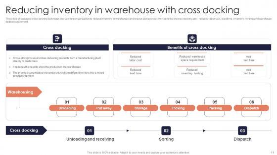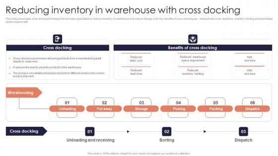 This slide showcases cross docking technique that can help organization to reduce inventory in warehouse and reduce storage cost. Key benefits of corss docking are reduced labor cost, lead time, inventory holding and warehouse space requirement. This Reducing Inventory Warehouse Minimizing Inventory Wastage Through Warehouse Portrait Pdf is perfect for any presentation, be it in front of clients or colleagues. It is a versatile and stylish solution for organizing your meetings. The Reducing Inventory Warehouse Minimizing Inventory Wastage Through Warehouse Portrait Pdf features a modern design for your presentation meetings. The adjustable and customizable slides provide unlimited possibilities for acing up your presentation. Slidegeeks has done all the homework before launching the product for you. So, do not wait, grab the presentation templates today This slide showcases cross docking technique that can help organization to reduce inventory in warehouse and reduce storage cost. Key benefits of corss docking are reduced labor cost, lead time, inventory holding and warehouse space requirement.