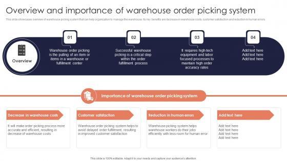 This slide showcases overview of warehouse picking system that can help organization to manage the warehouse. Its key benefits are decrease in warehouse costs, customer satisfaction and reduction in human errors. Crafting an eye catching presentation has never been more straightforward. Let your presentation shine with this tasteful yet straightforward Overview Importance Warehouse Minimizing Inventory Wastage Through Warehouse Download Pdf template. It offers a minimalistic and classy look that is great for making a statement. The colors have been employed intelligently to add a bit of playfulness while still remaining professional. Construct the ideal Overview Importance Warehouse Minimizing Inventory Wastage Through Warehouse Download Pdf that effortlessly grabs the attention of your audience Begin now and be certain to wow your customers This slide showcases overview of warehouse picking system that can help organization to manage the warehouse. Its key benefits are decrease in warehouse costs, customer satisfaction and reduction in human errors.