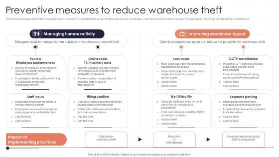 This slide showcases preventive measure that can be taken by organization to prevent theft in warehouse. It includes improving layout of warehouse and managing plus monitoring human activity in warehouse. Make sure to capture your audiences attention in your business displays with our gratis customizable Preventive Measures Reduce Minimizing Inventory Wastage Through Warehouse Guidelines Pdf. These are great for business strategies, office conferences, capital raising or task suggestions. If you desire to acquire more customers for your tech business and ensure they stay satisfied, create your own sales presentation with these plain slides. This slide showcases preventive measure that can be taken by organization to prevent theft in warehouse. It includes improving layout of warehouse and managing plus monitoring human activity in warehouse.