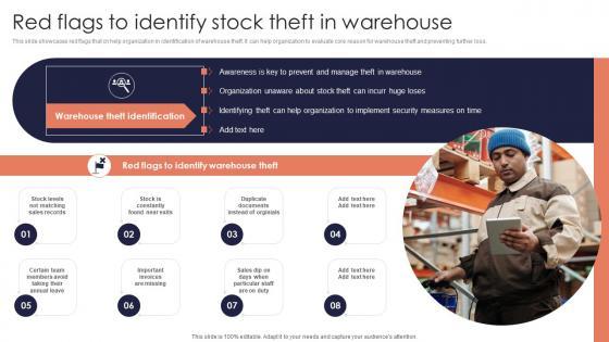 This slide showcases red flags that cn help organization in identification of warehouse theft. It can help organization to evaluate core reason for warehouse theft and preventing further loss. This modern and well arranged Red Flags To Identify Stock Minimizing Inventory Wastage Through Warehouse Topics Pdf provides lots of creative possibilities. It is very simple to customize and edit with the Powerpoint Software. Just drag and drop your pictures into the shapes. All facets of this template can be edited with Powerpoint, no extra software is necessary. Add your own material, put your images in the places assigned for them, adjust the colors, and then you can show your slides to the world, with an animated slide included. This slide showcases red flags that cn help organization in identification of warehouse theft. It can help organization to evaluate core reason for warehouse theft and preventing further loss.