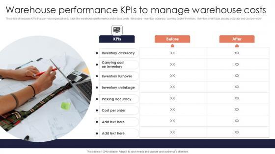 This slide showcases KPIs that can help organization to track the warehouse performance and reduce costs. It includes inventory accuracy, carrying cost of inventory, inventory shrinkage, picking accuracy and cost per order. Retrieve professionally designed Warehouse Performance KPIs Minimizing Inventory Wastage Through Warehouse Slides Pdf to effectively convey your message and captivate your listeners. Save time by selecting pre made slideshows that are appropriate for various topics, from business to educational purposes. These themes come in many different styles, from creative to corporate, and all of them are easily adjustable and can be edited quickly. Access them as PowerPoint templates or as Google Slides themes. You do not have to go on a hunt for the perfect presentation because Slidegeeks got you covered from everywhere. This slide showcases KPIs that can help organization to track the warehouse performance and reduce costs. It includes inventory accuracy, carrying cost of inventory, inventory shrinkage, picking accuracy and cost per order.