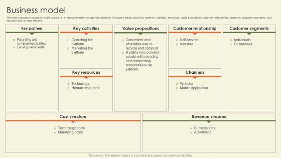 This slide presents a business model canvas for on-demand waste management platform. It includes details about key partners, activities, resources, value proposition, customer relationships, channels, customer segments, cost structure and revenue streams. Boost your pitch with our creative Business Model Waste Disposal Platform Pitch Deck Ppt Sample. Deliver an awe-inspiring pitch that will mesmerize everyone. Using these presentation templates you will surely catch everyones attention. You can browse the ppts collection on our website. We have researchers who are experts at creating the right content for the templates. So you do not have to invest time in any additional work. Just grab the template now and use them. This slide presents a business model canvas for on-demand waste management platform. It includes details about key partners, activities, resources, value proposition, customer relationships, channels, customer segments, cost structure and revenue streams.