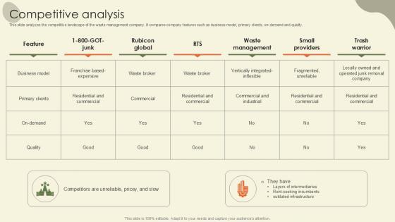 This slide analyzes the competitive landscape of the waste management company. It compares company features such as business model, primary clients, on demand and quality. Want to ace your presentation in front of a live audience Our Competitive Analysis Waste Disposal Platform Pitch Deck Ppt Example can help you do that by engaging all the users towards you. Slidegeeks experts have put their efforts and expertise into creating these impeccable powerpoint presentations so that you can communicate your ideas clearly. Moreover, all the templates are customizable, and easy-to-edit and downloadable. Use these for both personal and commercial use. This slide analyzes the competitive landscape of the waste management company. It compares company features such as business model, primary clients, on demand and quality.