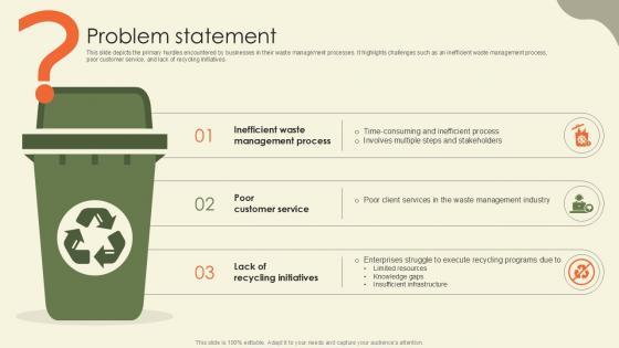 This slide depicts the primary hurdles encountered by businesses in their waste management processes. It highlights challenges such as an inefficient waste management process, poor customer service, and lack of recycling initiatives. Formulating a presentation can take up a lot of effort and time, so the content and message should always be the primary focus. The visuals of the PowerPoint can enhance the presenters message, so our Problem Statement Waste Disposal Platform Pitch Deck Ppt Sample was created to help save time. Instead of worrying about the design, the presenter can concentrate on the message while our designers work on creating the ideal templates for whatever situation is needed. Slidegeeks has experts for everything from amazing designs to valuable content, we have put everything into Problem Statement Waste Disposal Platform Pitch Deck Ppt Sample This slide depicts the primary hurdles encountered by businesses in their waste management processes. It highlights challenges such as an inefficient waste management process, poor customer service, and lack of recycling initiatives.