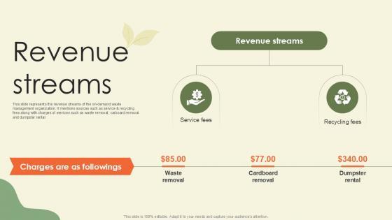 This slide represents the revenue streams of the on demand waste management organization. It mentions sources such as service and recycling fees along with charges of services such as waste removal, carboard removal and dumpster rental. This modern and well-arranged Revenue Streams Waste Disposal Platform Pitch Deck Ppt Example provides lots of creative possibilities. It is very simple to customize and edit with the Powerpoint Software. Just drag and drop your pictures into the shapes. All facets of this template can be edited with Powerpoint, no extra software is necessary. Add your own material, put your images in the places assigned for them, adjust the colors, and then you can show your slides to the world, with an animated slide included. This slide represents the revenue streams of the on demand waste management organization. It mentions sources such as service and recycling fees along with charges of services such as waste removal, carboard removal and dumpster rental.