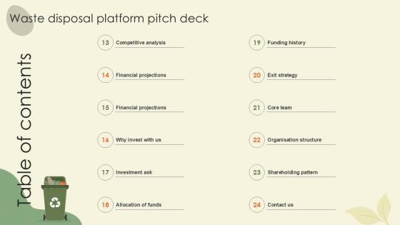 Welcome to our selection of the Table Of Contents Waste Disposal Platform Pitch Deck Ppt Example. These are designed to help you showcase your creativity and bring your sphere to life. Planning and Innovation are essential for any business that is just starting out. This collection contains the designs that you need for your everyday presentations. All of our PowerPoints are 100Percent editable, so you can customize them to suit your needs. This multi-purpose template can be used in various situations. Grab these presentation templates today. Our Table Of Contents Waste Disposal Platform Pitch Deck Ppt Example are topically designed to provide an attractive backdrop to any subject. Use them to look like a presentation pro.