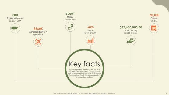 This slide presents the key figures and facts associated with the company. It includes facts such as gross merchandise value, MoM growth. funding raised till date, business expansion, orders and transactions. If your project calls for a presentation, then Slidegeeks is your go-to partner because we have professionally designed, easy-to-edit templates that are perfect for any presentation. After downloading, you can easily editKey Facts Waste Disposal Platform Pitch Deck Ppt Slides and make the changes accordingly. You can rearrange slides or fill them with different images. Check out all the handy templates This slide presents the key figures and facts associated with the company. It includes facts such as gross merchandise value, MoM growth. funding raised till date, business expansion, orders and transactions.