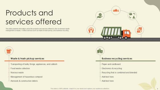 This slide presents information about the products and services offered by the on-demand waste management company. It offers services such as waste and trash pickup, and business recycling. Coming up with a presentation necessitates that the majority of the effort goes into the content and the message you intend to convey. The visuals of a PowerPoint presentation can only be effective if it supplements and supports the story that is being told. Keeping this in mind our experts created Products And Services Offered Waste Disposal Platform Pitch Deck Ppt Slides to reduce the time that goes into designing the presentation. This way, you can concentrate on the message while our designers take care of providing you with the right template for the situation. This slide presents information about the products and services offered by the on-demand waste management company. It offers services such as waste and trash pickup, and business recycling.