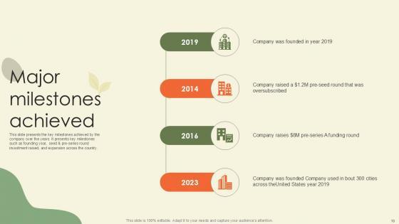 This slide presents the key milestones achieved by the company over the years. It presents key milestones such as founding year, seed and pre series round investment raised, and expansion across the country. If you are looking for a format to display your unique thoughts, then the professionally designed Major Milestones Achieved Waste Disposal Platform Pitch Deck Ppt Sample is the one for you. You can use it as a Google Slides template or a PowerPoint template. Incorporate impressive visuals, symbols, images, and other charts. Modify or reorganize the text boxes as you desire. Experiment with shade schemes and font pairings. Alter, share or cooperate with other people on your work. Download Major Milestones Achieved Waste Disposal Platform Pitch Deck Ppt Sample and find out how to give a successful presentation. Present a perfect display to your team and make your presentation unforgettable. This slide presents the key milestones achieved by the company over the years. It presents key milestones such as founding year, seed and pre series round investment raised, and expansion across the country.
