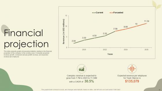 This slide presents graphs showcasing statistics relating to the financial projection of the company in the coming years. It includes projected revenue growth, compound annual growth revenue, and expected revenue per employee. Slidegeeks is here to make your presentations a breeze with Financial Projection Waste Disposal Platform Pitch Deck Ppt Sample With our easy-to-use and customizable templates, you can focus on delivering your ideas rather than worrying about formatting. With a variety of designs to choose from, you are sure to find one that suits your needs. And with animations and unique photos, illustrations, and fonts, you can make your presentation pop. So whether you are giving a sales pitch or presenting to the board, make sure to check out Slidegeeks first This slide presents graphs showcasing statistics relating to the financial projection of the company in the coming years. It includes projected revenue growth, compound annual growth revenue, and expected revenue per employee.