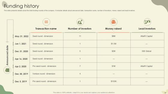This slide presents details about the total funding rounds of the company. It includes details about announced date, transaction name, number of investors, money raised and lead investors. Do you have an important presentation coming up Are you looking for something that will make your presentation stand out from the rest Look no further than Funding History Waste Disposal Platform Pitch Deck Ppt Example. With our professional designs, you can trust that your presentation will pop and make delivering it a smooth process. And with Slidegeeks, you can trust that your presentation will be unique and memorable. So why wait Grab Funding History Waste Disposal Platform Pitch Deck Ppt Example today and make your presentation stand out from the rest This slide presents details about the total funding rounds of the company. It includes details about announced date, transaction name, number of investors, money raised and lead investors.