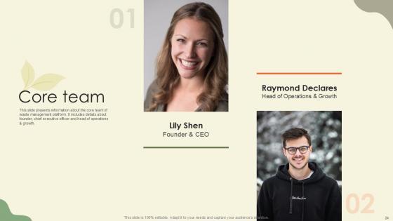 This slide presents information about the core team of waste management platform. It includes details about founder, chief executive officer and head of operations and growth. Do you have to make sure that everyone on your team knows about any specific topic I yes, then you should give Core Team Waste Disposal Platform Pitch Deck Ppt Slides a try. Our experts have put a lot of knowledge and effort into creating this impeccable Core Team Waste Disposal Platform Pitch Deck Ppt Slides. You can use this template for your upcoming presentations, as the slides are perfect to represent even the tiniest detail. You can download these templates from the Slidegeeks website and these are easy to edit. So grab these today This slide presents information about the core team of waste management platform. It includes details about founder, chief executive officer and head of operations and growth.