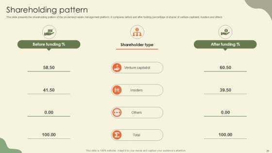 This slide presents the shareholding pattern of the on-demand waste management platform. It compares before and after funding percentage of shares of venture capitalist, insiders and others. This Shareholding Pattern Waste Disposal Platform Pitch Deck Ppt Slides is perfect for any presentation, be it in front of clients or colleagues. It is a versatile and stylish solution for organizing your meetings. The Shareholding Pattern Waste Disposal Platform Pitch Deck Ppt Slides features a modern design for your presentation meetings. The adjustable and customizable slides provide unlimited possibilities for acing up your presentation. Slidegeeks has done all the homework before launching the product for you. So, do not wait, grab the presentation templates today This slide presents the shareholding pattern of the on-demand waste management platform. It compares before and after funding percentage of shares of venture capitalist, insiders and others.