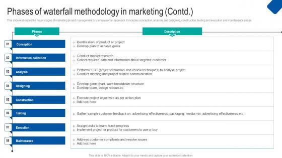 This slide showcases the major stages of marketing project management by using waterfall approach. It includes conception, information collection, analysis and designing, construction, testing or verification and deployment or maintenance phase. Do you have an important presentation coming up Are you looking for something that will make your presentation stand out from the rest Look no further than Phases Of Waterfall Methodology In Marketing Projects Ideas PDF. With our professional designs, you can trust that your presentation will pop and make delivering it a smooth process. And with Slidegeeks, you can trust that your presentation will be unique and memorable. So why wait Grab Phases Of Waterfall Methodology In Marketing Projects Ideas PDF today and make your presentation stand out from the rest
