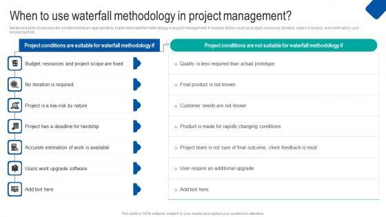 This slide showcases the appropriate conditions to implement waterfall approach in marketing projects. It includes incorporates product development and evolution, web design project, system migration, project flexibility, SEO marketing etc. Presenting this PowerPoint presentation, titled When Use Waterfall Methodology Waterfall Project Management Strategy Construction Industry Formats Pdf, with topics curated by our researchers after extensive research. This editable presentation is available for immediate download and provides attractive features when used. Download now and captivate your audience. Presenting this When Use Waterfall Methodology Waterfall Project Management Strategy Construction Industry Formats Pdf. Our researchers have carefully researched and created these slides with all aspects taken into consideration. This is a completely customizable When Use Waterfall Methodology Waterfall Project Management Strategy Construction Industry Formats Pdf that is available for immediate downloading. Download now and make an impact on your audience. Highlight the attractive features available with our PPTs. This slide showcases the appropriate conditions to implement waterfall approach in marketing projects. It includes incorporates product development and evolution, web design project, system migration, project flexibility, SEO marketing etc.
