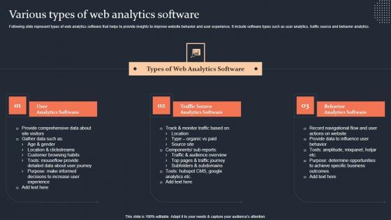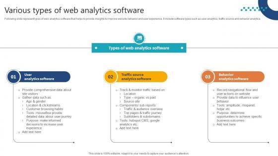 Following slide represent types of web analytics software that helps to provide insights to improve website behavior and user experience. It include software types such as user analytics, traffic source and behavior analytics. From laying roadmaps to briefing everything in detail, our templates are perfect for you. You can set the stage with your presentation slides. All you have to do is download these easy-to-edit and customizable templates. Various Types Of Web Analytics Software Step By Step Guide Slides PDF will help you deliver an outstanding performance that everyone would remember and praise you for. Do download this presentation today. Following slide represent types of web analytics software that helps to provide insights to improve website behavior and user experience. It include software types such as user analytics, traffic source and behavior analytics.
