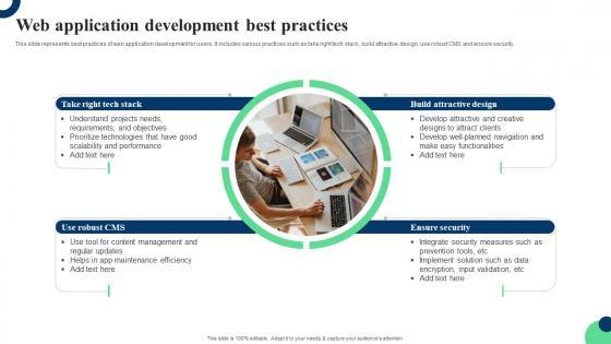 This slide represents best practices of web application development for users. It includes various practices such as take right tech stack, build attractive design, use robust CMS and ensure security. Showcasing this set of slides titled Web Application Development Best Practices Ppt Inspiration Tips Pdf. The topics addressed in these templates are Right Tech Stack, Build Attractive Design, Use Robust CMS. All the content presented in this PPT design is completely editable. Download it and make adjustments in color, background, font etc. as per your unique business setting. This slide represents best practices of web application development for users. It includes various practices such as take right tech stack, build attractive design, use robust CMS and ensure security.