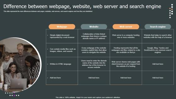 This slide represents the main differences between web pages, websites, web servers, and search engines and how they are interlinked. From laying roadmaps to briefing everything in detail, our templates are perfect for you. You can set the stage with your presentation slides. All you have to do is download these easy-to-edit and customizable templates. Difference Between Webpage Role Web Designing User Engagement Download PDF will help you deliver an outstanding performance that everyone would remember and praise you for. Do download this presentation today. This slide represents the main differences between web pages, websites, web servers, and search engines and how they are interlinked.