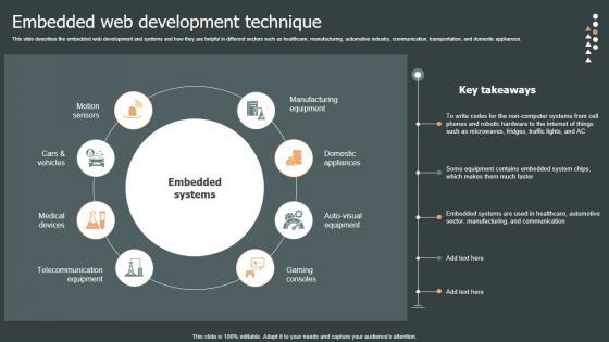 This slide describes the embedded web development and systems and how they are helpful in different sectors such as healthcare, manufacturing, automotive industry, communication, transportation, and domestic appliances. Present like a pro with Embedded Web Development Role Web Designing User Engagement Brochure PDF Create beautiful presentations together with your team, using our easy-to-use presentation slides. Share your ideas in real-time and make changes on the fly by downloading our templates. So whether you are in the office, on the go, or in a remote location, you can stay in sync with your team and present your ideas with confidence. With Slidegeeks presentation got a whole lot easier. Grab these presentations today. This slide describes the embedded web development and systems and how they are helpful in different sectors such as healthcare, manufacturing, automotive industry, communication, transportation, and domestic appliances.