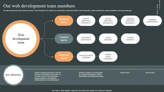 This slide represents the team members required in web development. All members are responsible for mainly three tasks in web development content management, content presentation, and programming logic. This Our Web Development Team Role Web Designing User Engagement Download PDF is perfect for any presentation, be it in front of clients or colleagues. It is a versatile and stylish solution for organizing your meetings. The Our Web Development Team Role Web Designing User Engagement Download PDF features a modern design for your presentation meetings. The adjustable and customizable slides provide unlimited possibilities for acing up your presentation. Slidegeeks has done all the homework before launching the product for you. So, do not wait, grab the presentation templates today This slide represents the team members required in web development. All members are responsible for mainly three tasks in web development content management, content presentation, and programming logic.