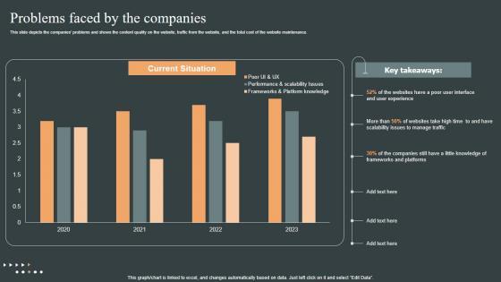 This slide depicts the companies problems and shows the content quality on the website, traffic from the website, and the total cost of the website maintenance. Explore a selection of the finest Problems Faced By The Companies Role Web Designing User Engagement Introduction PDF here. With a plethora of professionally designed and pre-made slide templates, you can quickly and easily find the right one for your upcoming presentation. You can use our Problems Faced By The Companies Role Web Designing User Engagement Introduction PDF to effectively convey your message to a wider audience. Slidegeeks has done a lot of research before preparing these presentation templates. The content can be personalized and the slides are highly editable. Grab templates today from Slidegeeks. This slide depicts the companies problems and shows the content quality on the website, traffic from the website, and the total cost of the website maintenance.