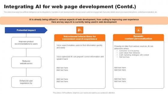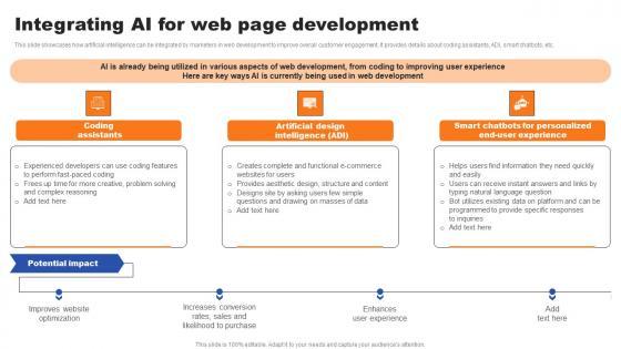 This slide showcases how artificial intelligence can be integrated by marketers in web development to improve overall customer engagement. It provides details about coding assistants, ADI, smart chatbots, etc. Do you have an important presentation coming up Are you looking for something that will make your presentation stand out from the rest Look no further than Integrating AI For Web Page Development Ppt Layouts Summary Pdf. With our professional designs, you can trust that your presentation will pop and make delivering it a smooth process. And with Slidegeeks, you can trust that your presentation will be unique and memorable. So why wait Grab Integrating AI For Web Page Development Ppt Layouts Summary Pdf today and make your presentation stand out from the rest This slide showcases how artificial intelligence can be integrated by marketers in web development to improve overall customer engagement. It provides details about coding assistants, ADI, smart chatbots, etc.