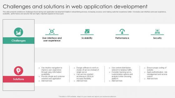 This slide presents solutions to challenges faced during web application development helpful in streamlining process, increasing accuracy and making customer experience better. It includes user interface and user experience, scalability, performance and security that are highly important aspects to focus upon. There are so many reasons you need a Challenges And Solutions In Web Application Development PPT Template SS. The first reason is you can not spend time making everything from scratch, Thus, Slidegeeks has made presentation templates for you too. You can easily download these templates from our website easily. This slide presents solutions to challenges faced during web application development helpful in streamlining process, increasing accuracy and making customer experience better. It includes user interface and user experience, scalability, performance and security that are highly important aspects to focus upon