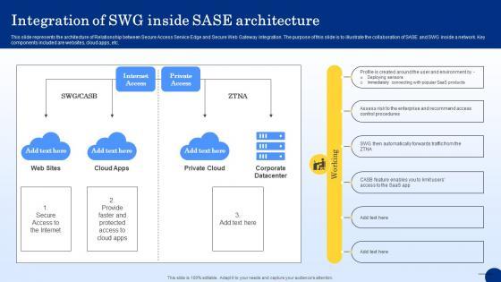 This slide represents the architecture of Relationship between Secure Access Service Edge and Secure Web Gateway integration. The purpose of this slide is to illustrate the collaboration of SASE and SWG inside a network. Key components included are websites, cloud apps, etc. Coming up with a presentation necessitates that the majority of the effort goes into the content and the message you intend to convey. The visuals of a PowerPoint presentation can only be effective if it supplements and supports the story that is being told. Keeping this in mind our experts created Integration Of SWG Inside SASE Architecture Web Threat Protection System to reduce the time that goes into designing the presentation. This way, you can concentrate on the message while our designers take care of providing you with the right template for the situation. This slide represents the architecture of Relationship between Secure Access Service Edge and Secure Web Gateway integration. The purpose of this slide is to illustrate the collaboration of SASE and SWG inside a network. Key components included are websites, cloud apps, etc.