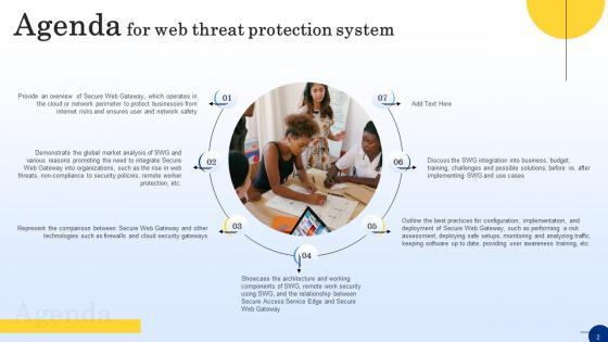 Boost your pitch with our creative Agenda For Web Threat Protection System Ppt Infographics. Deliver an awe-inspiring pitch that will mesmerize everyone. Using these presentation templates you will surely catch everyones attention. You can browse the ppts collection on our website. We have researchers who are experts at creating the right content for the templates. So you do not have to invest time in any additional work. Just grab the template now and use them. Our Agenda For Web Threat Protection System Ppt Infographics are topically designed to provide an attractive backdrop to any subject. Use them to look like a presentation pro.