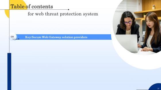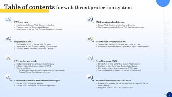 Whether you have daily or monthly meetings, a brilliant presentation is necessary. Table Of Contents For Web Threat Protection System Ppt Formates can be your best option for delivering a presentation. Represent everything in detail using Table Of Contents For Web Threat Protection System Ppt Formates and make yourself stand out in meetings. The template is versatile and follows a structure that will cater to your requirements. All the templates prepared by Slidegeeks are easy to download and edit. Our research experts have taken care of the corporate themes as well. So, give it a try and see the results. Our Table Of Contents For Web Threat Protection System Ppt Formates are topically designed to provide an attractive backdrop to any subject. Use them to look like a presentation pro.