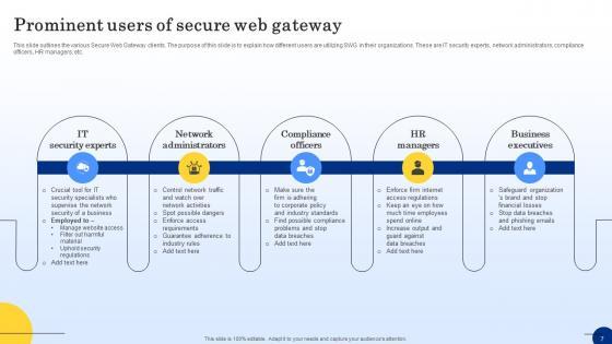 This slide outlines the various Secure Web Gateway clients. The purpose of this slide is to explain how different users are utilizing SWG in their organizations. These are IT security experts, network administrators, compliance officers, HR managers, etc. Retrieve professionally designed Prominent Users Of Secure Web Gateway Web Threat Protection System to effectively convey your message and captivate your listeners. Save time by selecting pre-made slideshows that are appropriate for various topics, from business to educational purposes. These themes come in many different styles, from creative to corporate, and all of them are easily adjustable and can be edited quickly. Access them as PowerPoint templates or as Google Slides themes. You do not have to go on a hunt for the perfect presentation because Slidegeeks got you covered from everywhere. This slide outlines the various Secure Web Gateway clients. The purpose of this slide is to explain how different users are utilizing SWG in their organizations. These are IT security experts, network administrators, compliance officers, HR managers, etc.