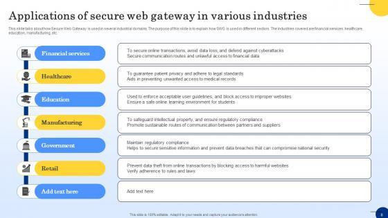 This slide talks about how Secure Web Gateway is used in several industrial domains. The purpose of this slide is to explain how SWG is used in different sectors. The industries covered are financial services, healthcare, education, manufacturing, etc. Create an editable Applications Of Secure Web Gateway In Various Industries Web Threat Protection System that communicates your idea and engages your audience. Whether you are presenting a business or an educational presentation, pre-designed presentation templates help save time. Applications Of Secure Web Gateway In Various Industries Web Threat Protection System is highly customizable and very easy to edit, covering many different styles from creative to business presentations. Slidegeeks has creative team members who have crafted amazing templates. So, go and get them without any delay. This slide talks about how Secure Web Gateway is used in several industrial domains. The purpose of this slide is to explain how SWG is used in different sectors. The industries covered are financial services, healthcare, education, manufacturing, etc.