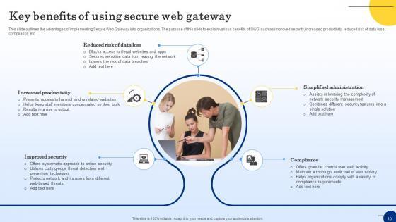 This slide outlines the advantages of implementing Secure Web Gateway into organizations. The purpose of this slide to explain various benefits of SWG such as improved security, increased productivity, reduced risk of data loss, compliance, etc. Welcome to our selection of the Key Benefits Of Using Secure Web Gateway Web Threat Protection System. These are designed to help you showcase your creativity and bring your sphere to life. Planning and Innovation are essential for any business that is just starting out. This collection contains the designs that you need for your everyday presentations. All of our PowerPoints are 100Percent editable, so you can customize them to suit your needs. This multi-purpose template can be used in various situations. Grab these presentation templates today. This slide outlines the advantages of implementing Secure Web Gateway into organizations. The purpose of this slide to explain various benefits of SWG such as improved security, increased productivity, reduced risk of data loss, compliance, etc.